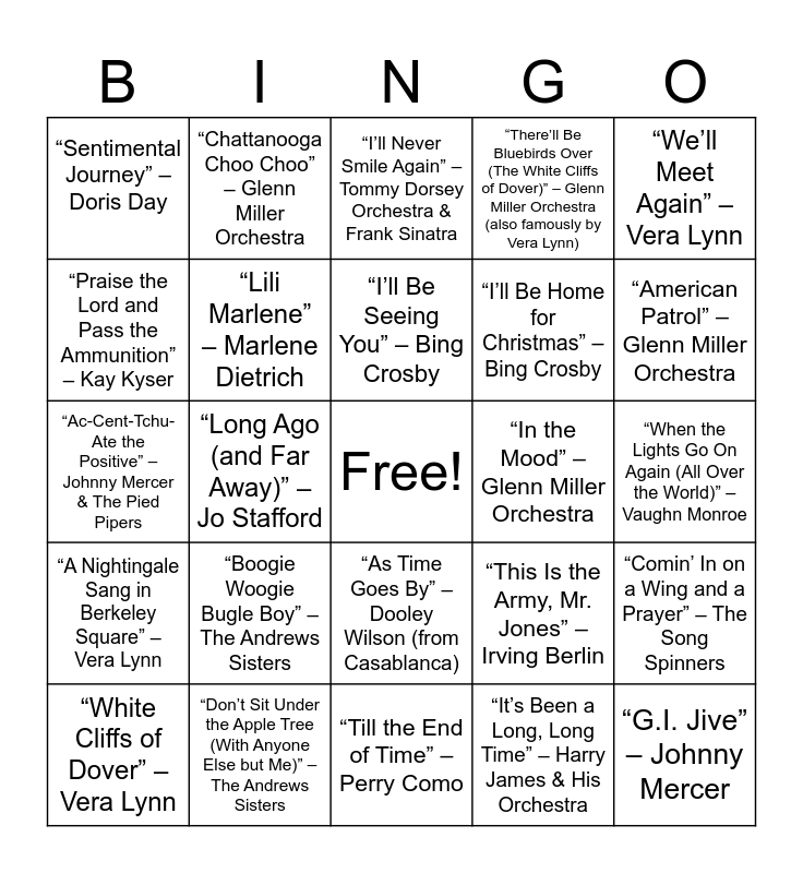 This bingo card has a free space and 24 words: “Boogie Woogie Bugle Boy” – The Andrews Sisters, “Don’t Sit Under the Apple Tree (With Anyone Else but Me)” – The Andrews Sisters, “I’ll Be Seeing You” – Bing Crosby, “White Cliffs of Dover” – Vera Lynn, “We’ll Meet Again” – Vera Lynn, “Sentimental Journey” – Doris Day, “Praise the Lord and Pass the Ammunition” – Kay Kyser, “Chattanooga Choo Choo” – Glenn Miller Orchestra, “In the Mood” – Glenn Miller Orchestra, “As Time Goes By” – Dooley Wilson (from Casablanca), “I’ll Be Home for Christmas” – Bing Crosby, “Ac-Cent-Tchu-Ate the Positive” – Johnny Mercer & The Pied Pipers, “This Is the Army, Mr. Jones” – Irving Berlin, “Comin’ In on a Wing and a Prayer” – The Song Spinners, “Lili Marlene” – Marlene Dietrich, “It’s Been a Long, Long Time” – Harry James & His Orchestra, “When the Lights Go On Again (All Over the World)” – Vaughn Monroe, “I’ll Never Smile Again” – Tommy Dorsey Orchestra & Frank Sinatra, “American Patrol” – Glenn Miller Orchestra, “Long Ago (and Far Away)” – Jo Stafford, “G.I. Jive” – Johnny Mercer, “A Nightingale Sang in Berkeley Square” – Vera Lynn, “There’ll Be Bluebirds Over (The White Cliffs of Dover)” – Glenn Miller Orchestra (also famously by Vera Lynn) and “Till the End of Time” – Perry Como.