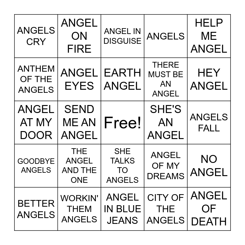 This bingo card has a free space and 46 words: ONLY ANGEL, ANGEL OF DEATH, ANGEL WITH A SHOTGUN, ANGEL IN BLUE JEANS, THE ANGEL AND THE ONE, CITY OF ANGELS, ANGEL ON FIRE, EVIL ANGEL, ANTHEM OF THE ANGELS, LIPS OF AN ANGEL, ANGEL EYES, ANGELS, NO ANGEL, ANGEL OF MY DREAMS, WASTING ANGELS, DON'T CALL ME ANGEL, EARTH ANGEL, SHE'S AN ANGEL, ANGELEYES, HELP ME ANGEL, SEND ME AN ANGEL, CITY OF THE ANGELS, ANGELS CRY, THERE MUST BE AN ANGEL, ANGEL OF THE MORNING, HEY ANGEL, BETTER ANGELS, CALLING ALL ANGELS, SHE TALKS TO ANGELS, GOODBYE ANGELS, FALLEN ANGEL, ANGEL, WON'T YOU CALL ME?, EVERY ANGEL IS TERRIFYING, ANGEL DOWN, ANGEL OF HARLEM, WORKIN' THEM ANGELS, ANGELS FALL, ANGEL FLYING TOO CLOSE TO THE GROUND, SEVEN SPANISH ANGELS, ANGEL OF MUSIC, FLY TO THE ANGELS, ANGEL IN DISGUISE, ANGEL AT MY DOOR, ANGELS OF THE SILENCES, ANGELS ON VACATION and ANGELS IN EVERYTHING.