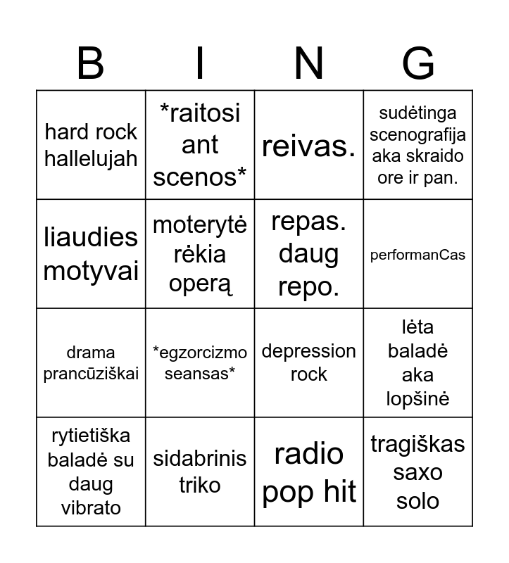 This bingo card has 16 words: sidabrinis triko, lėta baladė aka lopšinė, reivas., hard rock hallelujah, drama prancūziškai, *raitosi ant scenos*, depression rock, radio pop hit, liaudies motyvai, moterytė rėkia operą, rytietiška baladė su daug vibrato, sudėtinga scenografija aka skraido ore ir pan., *egzorcizmo seansas*, performanCas, repas. daug repo. and tragiškas saxo solo.