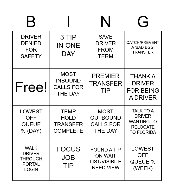 This bingo card has 16 words: FOCUS JOB TIP, TALK TO A DRIVER WANTING TO RELOCATE TO FLORIDA, SAVE DRIVER FROM TERM, DRIVER DENIED FOR SAFETY, LOWEST OFF QUEUE % (DAY), 3 TIP IN ONE DAY, MOST OUTBOUND CALLS FOR THE DAY, FOUND A TIP ON WAIT LIST/VISIBILE NEED VIEW, Free!, MOST INBOUND CALLS FOR THE DAY, WALK DRIVER THROUGH PORTAL LOGIN, CATCH/PREVENT A 'BAD EGG' TRANSFER, TEMP HOLD TRANSFER COMPLETE, THANK A DRIVER FOR BEING A DRIVER, PREMIER TRANSFER TIP and LOWEST OFF QUEUE % (WEEK).