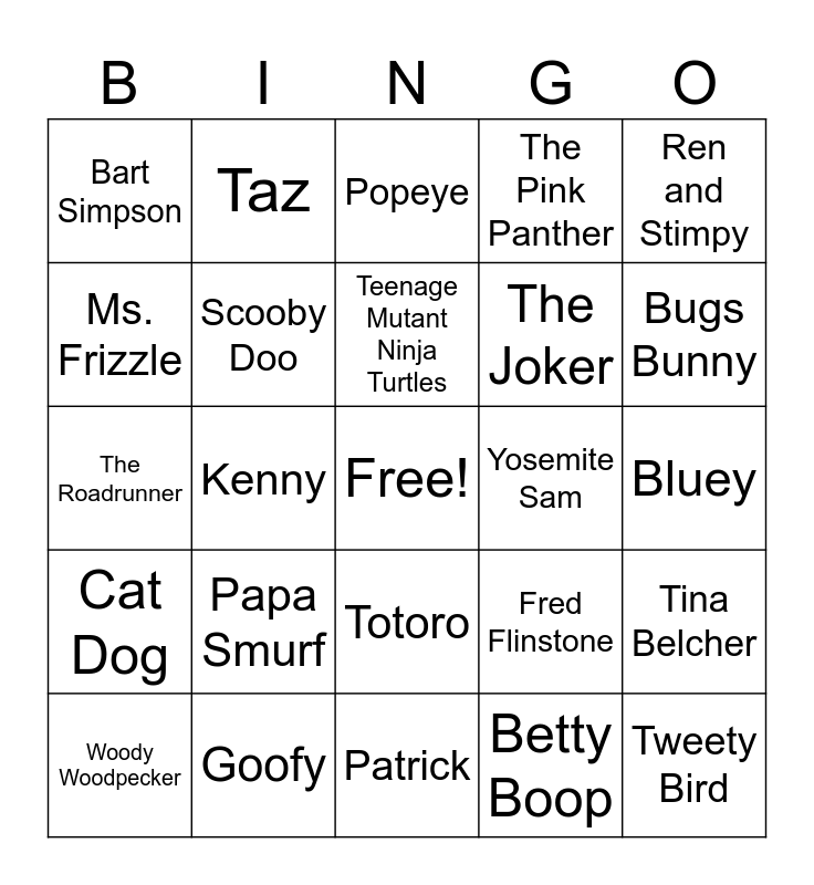 This bingo card has a free space and 29 words: Woody Woodpecker, Dora, Kenny, Stewie, Bart Simpson, Popeye, Scooby Doo, Papa Smurf, Yosemite Sam, Goofy, Bluey, Tweety Bird, Patrick, Betty Boop, Bugs Bunny, Finn the human, Totoro, Cat Dog, Ren and Stimpy, The Roadrunner, Fred Flinstone, Garfield, The Joker, Ms. Frizzle, The Pink Panther, Taz, Tina Belcher, Teenage Mutant Ninja Turtles and Kim Possible.