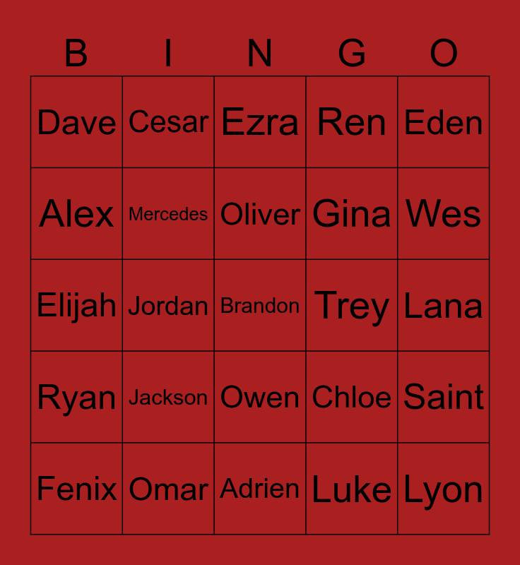 This bingo card has 25 words: Jackson, Adrien, Oliver, Fenix, Eden, Dave, Alex, Cesar, Trey, Owen, Gina, Elijah, Chloe, Saint, Mercedes, Lyon, Lana, Ezra, Wes, Jordan, Brandon, Omar, Ryan, Ren and Luke.
