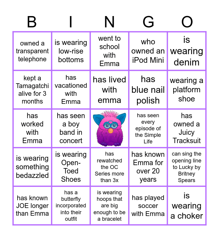 This bingo card has a free space and 24 words: is wearing Open-Toed Shoes, has a butterfly incorporated into their outfit, has lived with emma, has known JOE longer than Emma, is wearing denim, owned a transparent telephone, kept a Tamagatchi alive for 3 months, is wearing low-rise bottoms, has seen every episode of the Simple Life, has rewatched the OC Series more than 3x, has blue nail polish, has worked with Emma, has known Emma for over 20 years, can sing the opening line to Lucky by Britney Spears, has vacationed with Emma, has played soccer with Emma, has owned a Juicy Tracksuit, went to school with Emma, wearing a platform shoe, has seen a boy band in concert, is wearing a choker, is wearing something bedazzled, who owned an iPod Mini and is wearing hoops that are big enough to be a bracelet.