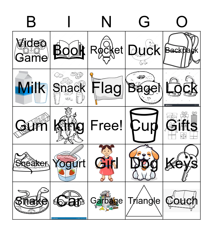 This bingo card has 24 images, a free space and 24 words: Yogurt, Car, Flag, Snake, Backpack, Video Game, Milk, Book, Cup, Girl, Bagel, Gum, Dog, Keys, Snack, Triangle, Gifts, Rocket, Lock, King, Couch, Sneaker, Duck and Garbage.