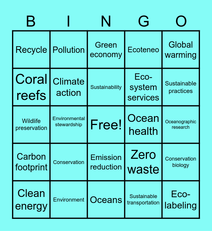 This bingo card has a free space and 24 words: Conservation, Environment, Sustainability, Clean energy, Global warming, Recycle, Coral reefs, Pollution, Ocean health, Emission reduction, Eco-system services, Wildlife preservation, Zero waste, Conservation biology, Climate action, Sustainable transportation, Oceanographic research, Green economy, Sustainable practices, Environmental stewardship, Eco-labeling, Carbon footprint, Ecoteneo and Oceans.