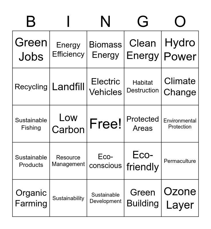 This bingo card has a free space and 24 words: Resource Management, Sustainability, Electric Vehicles, Organic Farming, Hydro Power, Green Jobs, Recycling, Energy Efficiency, Protected Areas, Eco-conscious, Habitat Destruction, Sustainable Fishing, Eco-friendly, Permaculture, Landfill, Green Building, Environmental Protection, Biomass Energy, Climate Change, Low Carbon, Ozone Layer, Sustainable Products, Clean Energy and Sustainable Development.