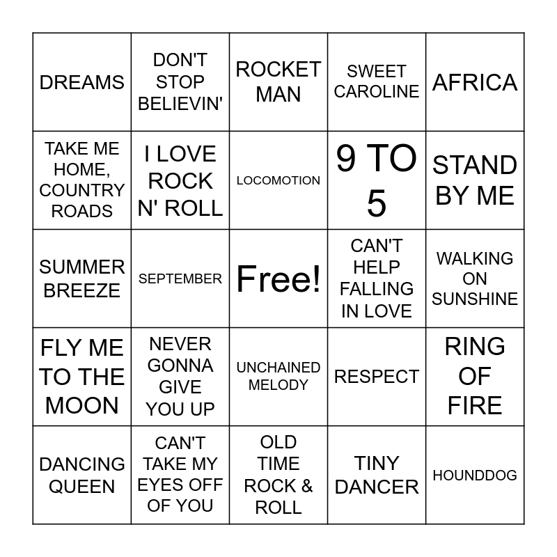 This bingo card has a free space and 24 words: NEVER GONNA GIVE YOU UP, CAN'T TAKE MY EYES OFF OF YOU, LOCOMOTION, DANCING QUEEN, AFRICA, DREAMS, TAKE ME HOME, COUNTRY ROADS, DON'T STOP BELIEVIN', CAN'T HELP FALLING IN LOVE, UNCHAINED MELODY, 9 TO 5, SUMMER BREEZE, RESPECT, RING OF FIRE, I LOVE ROCK N' ROLL, TINY DANCER, WALKING ON SUNSHINE, ROCKET MAN, STAND BY ME, SEPTEMBER, HOUNDDOG, FLY ME TO THE MOON, SWEET CAROLINE and OLD TIME ROCK & ROLL.