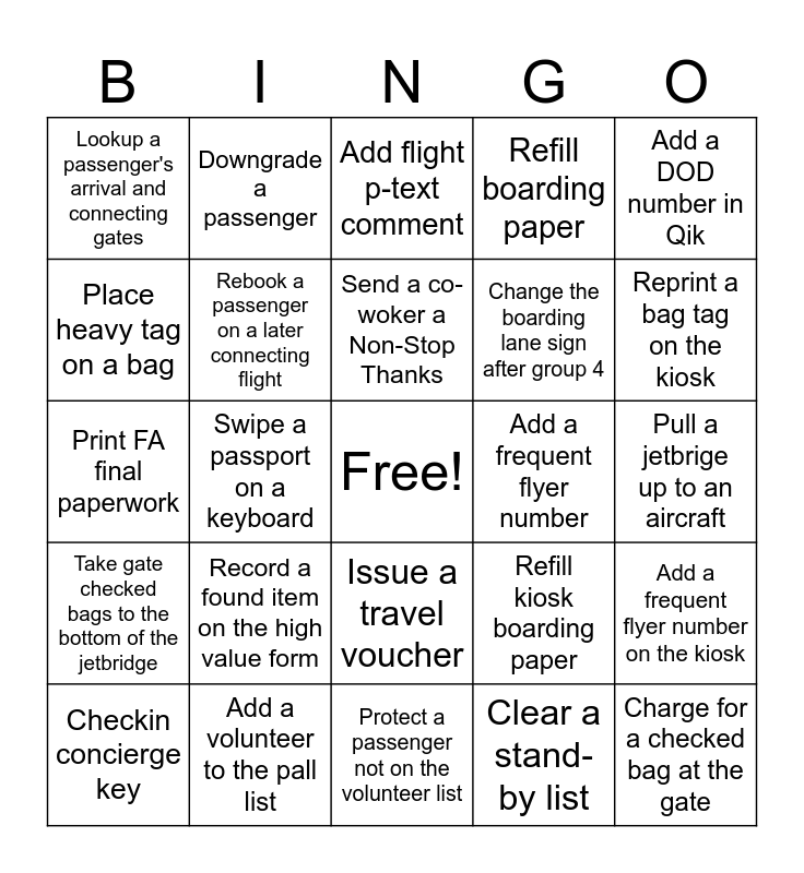 This bingo card has a free space and 75 words: Put a flight in closed status, List a cabin jumpseater, Add flight p-text comment, Restock gate, Reseat special needs passengers, Print a notice of compensation, Add a frequent flyer number in Qik, Rebook a passenger for another day, Catch a passenger trying to board with an oversized luggage, Put an active uniform military on the upgrade list, Delete a bag tag, Lookup a passenger by last name and flight number in the kiosk, Send a co-woker a Non-Stop Thanks, Place heavy tag on a bag, Find a battery attached to a checked or valet bag, Swipe a passport on a keyboard, Opup a passenger, Charge for a checked bag at the gate, Restock ticket counter, Add a DOD number in Qik, Catch a passenger trying to board with more than 2 items, Print FA final paperwork, Rebook a passenger on a later connecting flight, Downgrade a passenger, Refill boarding paper, Work a delayed flight, Put a flight in final status, Issue a meal voucher, Request a BCO, Rebook a passenger on a later flight, Add a global entry number on the kiosk, Refill bag tag paper, Send a recognition card through Recognition, Refill kiosk boarding paper, Reprint a bag tag on the kiosk, Change the boarding lane sign after group 4, Act as the D2 gate agent, Checkin an assistance device, Pull a jetbrige up to an aircraft, Clear a stand-by list, Cancel a free carry-on item bag tag, Scan a passport on the kiosk, Protect a passenger on the volunteer list, Pick up a piece of FOD, Open E175 door, Do a predeparture C walk, Checkin concierge key, Lookup a passenger's arrival and connecting gates, Put remarks in a PNR, Open 319 door, Manually type passport information, Issue a travel voucher, Activate a SMS bag tag, Place a weapon tag on a bag tag, Fix a passenger apis information, Take a kiosk out of service, Nominated a co-worker for the president's award, Gate check a stroller, Checkin a pet, List a cockpit jumpseater, Record a found item on the high value form, Rebook a passenger for a different destination, Refill kiosk bag tag paper, Charge for a heavy bag, Place an orange prioriy tag on a bag tag, Add a frequent flyer number, Issue a hotel voucher, Gate check a wheelchair, Remove passengers from the bx list, Add a frequent flyer number on the kiosk, Take gate checked bags to the bottom of the jetbridge, Add a volunteer to the pall list, Add a global entry number in Qik, Protect a passenger not on the volunteer list and Checkin an UNMR.