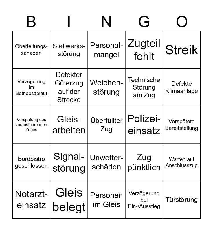 This bingo card has 25 words: Signal-störung, Personen im Gleis, Weichen-störung, Notarzt-einsatz, Streik, Oberleitungs-schaden, Verzögerung im Betriebsablauf, Stellwerks-störung, Polizei-einsatz, Unwetter-schäden, Technische Störung am Zug, Verspätung des vorausfahrenden Zuges, Zug pünktlich, Warten auf Anschlusszug, Defekter Güterzug auf der Strecke, Türstörung, Verspätete Bereitstellung, Personal-mangel, Defekte Klimaanlage, Gleis-arbeiten, Überfüllter Zug, Gleis belegt, Bordbistro geschlossen, Zugteil fehlt and Verzögerung bei Ein-/Ausstieg.