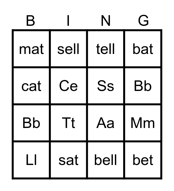 This bingo card has 16 words: sat, Mm, tell, mat, Bb, sell, Aa, bell, cat, Ce, Ll, bat, Tt, Bb, Ss and bet.