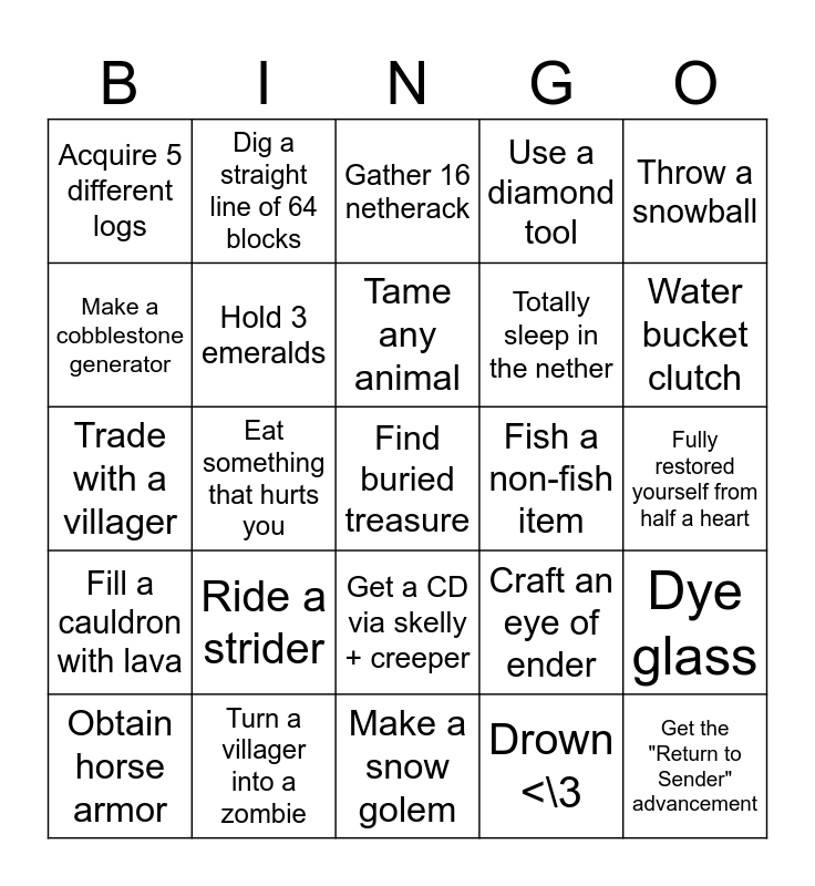 This bingo card has 75 words: Spawn a chicken from an egg, Kill a baby zombie, Gather 16 netherack, Eat dried kelp, Get a dolphin boost, Make a pumpkin pie, Breed 2 cows, Obtain lime wool, Plant + harvest carrots, Create a working redstone machine, Get the "Return to Sender" advancement, Craft a gold block, Tame any animal, Make a cobblestone generator, Reach the build limit, Eat something that hurts you, Craft a full set of wooden tools, Find buried treasure, Build pixel art of an in-game sprite, Throw a snowball, Take damage via suffocation in a block, Trade with a villager, Hold 3 emeralds, Dig a straight line of 64 blocks, Use a diamond tool, Satiate yourself with mushroom stew, Relieve a blaze of its rod, Kill a mob by deflecting its arrow, Dye leather armor, Fill a cauldron with water, Mine to y = -60, Fish an enchantment book, Befriend an enderman (look at him without angering him), Craft an eye of ender, Water bucket clutch, Totally sleep in the nether, Make a golden apple, Prepare a tier 1 beacon (9 blocks, no beacon itself), Fully restored yourself from half a heart, Drown <\3, Nomch a cookie, Bling yourself out (full gold armor), Obtain gilded blackstone, Wear 4 diff types of armor, Discover a jockey of any variety (including stacked striders), Become an author, Obtain horse armor, Acquire 5 different logs, Spot skulk, Tame puppy :3, Brew a potion, Get a CD via skelly + creeper, Make an aether portal (water + all), Craft a diamond armor piece, Enchant anything, Shear a sheep, Get 2 mobs to fight each other, Heal an iron golem with iron, Make a cake, Barter with a piglin, Ride a strider, Get a goat horn, Use milk to get rid of an effect, Kill a creeper without it blowing up, Make a golden carrot, Fish a non-fish item, Make a spyglass, Get powdered snow, Make a parkour course with at least 10 jumps, Dye glass, Fill a cauldron with lava, Turn a villager into a zombie, Build a house (4 walls, roof, crafting table, furnace, chest, bed, + door), Make a snow golem and Put a fish in a bucket.