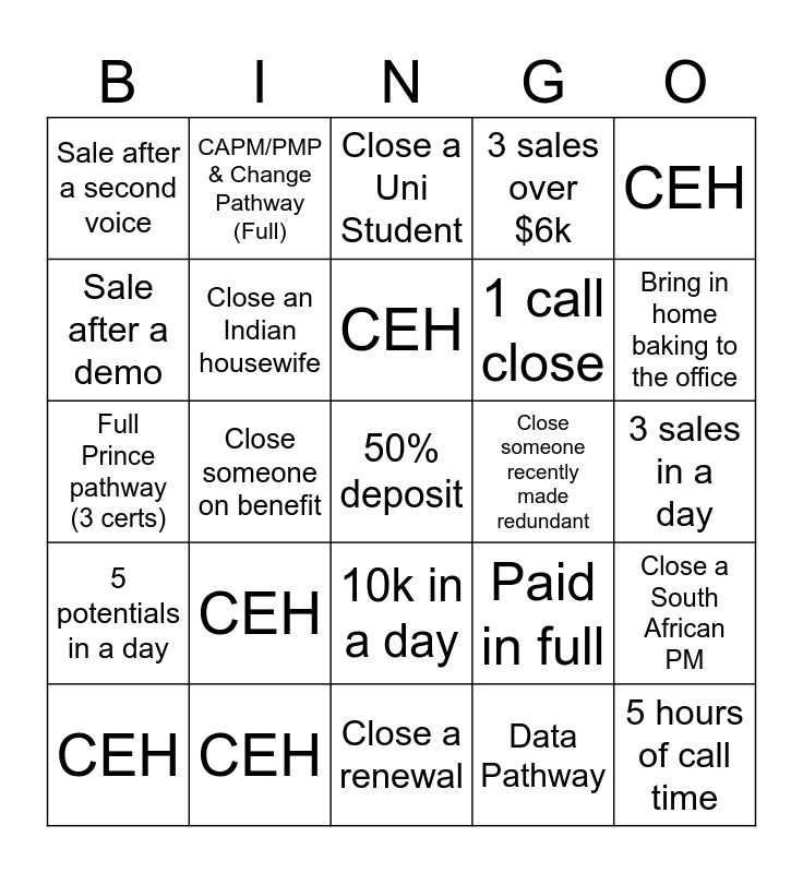 This bingo card has a free space and 24 words: CEH, CEH, CEH, CEH, CEH, Sale after a second voice, Sale after a demo, CAPM/PMP & Change Pathway (Full), Close someone recently made redundant, 10k in a day, 1 call close, Full Prince pathway (3 certs), Paid in full, Close a South African PM, Close an Indian housewife, Data Pathway, 3 sales in a day, Close a Uni Student, Bring in home baking to the office, Close someone on benefit, 5 hours of call time, 5 potentials in a day, 3 sales over $6k and Close a renewal.