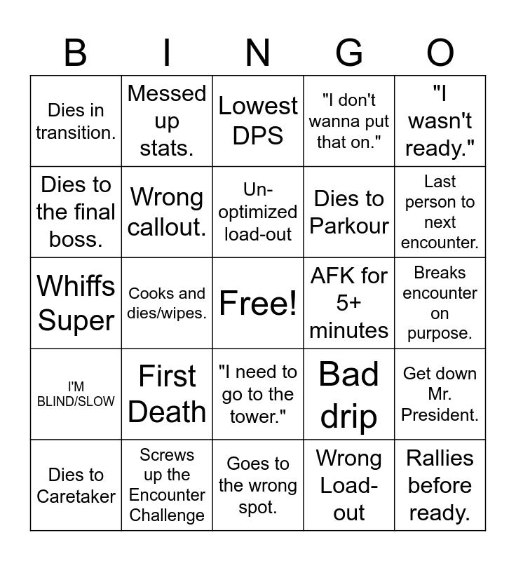 This bingo card has a free space and 24 words: First Death, Screws up the Encounter Challenge, Un-optimized load-out, Dies to Caretaker, "I wasn't ready.", Dies in transition., Dies to the final boss., Messed up stats., AFK for 5+ minutes, "I need to go to the tower.", Dies to Parkour, Whiffs Super, Bad drip, Get down Mr. President., Wrong callout., Wrong Load-out, Breaks encounter on purpose., Lowest DPS, Last person to next encounter., Cooks and dies/wipes., Rallies before ready., I'M BLIND/SLOW, "I don't wanna put that on." and Goes to the wrong spot..