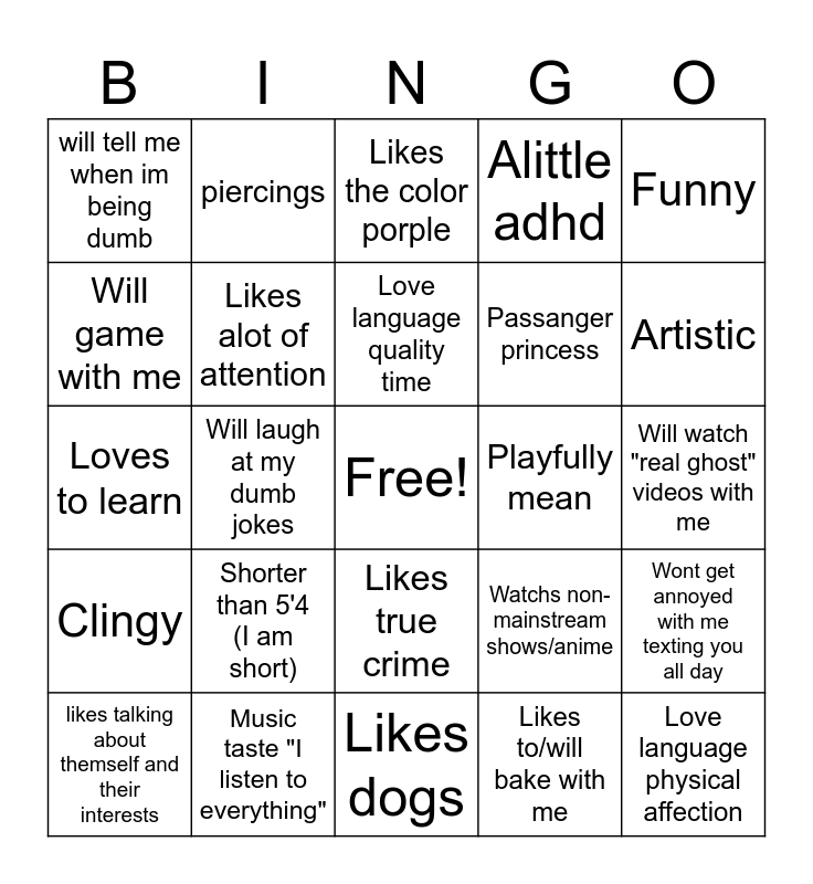 This bingo card has a free space and 24 words: Shorter than 5'4 (I am short), Music taste "I listen to everything", Love language quality time, likes talking about themself and their interests, Funny, will tell me when im being dumb, Will game with me, piercings, Playfully mean, Likes true crime, Passanger princess, Loves to learn, Watchs non-mainstream shows/anime, Wont get annoyed with me texting you all day, Likes alot of attention, Likes to/will bake with me, Will watch "real ghost" videos with me, Likes the color porple, Artistic, Will laugh at my dumb jokes, Love language physical affection, Clingy, Alittle adhd and Likes dogs.