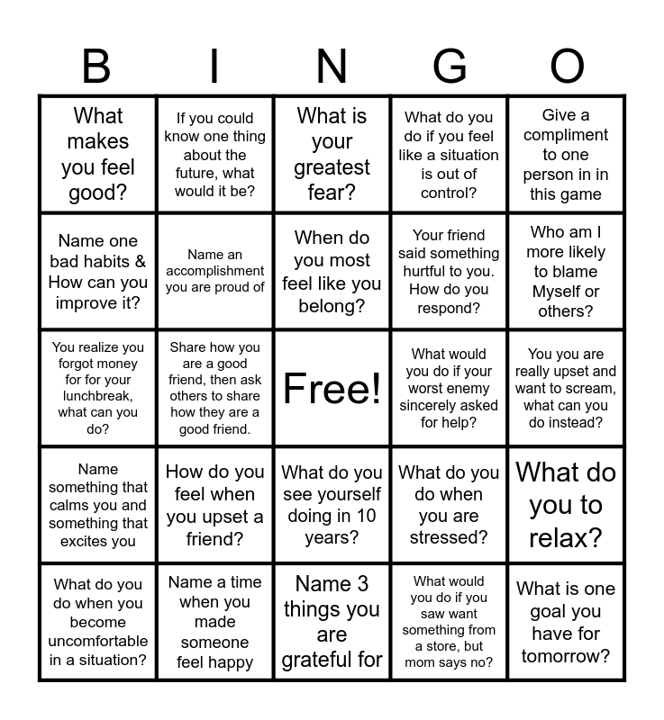 This bingo card has a free space and 29 words: What is something that makes you feel sad?, Name a time when you made someone feel happy, What is your greatest fear?, Who is your biggest supporter?, Give a compliment to one person in in this game, What makes you feel good?, Name an accomplishment you are proud of, When do you most feel like you belong?, What would you do if your worst enemy sincerely asked for help?, What do you to relax?, What do you do when you become uncomfortable in a situation?, Share how you are a good friend, then ask others to share how they are a good friend., What would you do if you saw want something from a store, but mom says no?, What is one goal you have for tomorrow?, You realize you forgot money for for your lunchbreak, what can you do?, What is one personal trigger you are aware of And how do you cope with it?, Name 3 things you are grateful for, What do you do when you are stressed?, Who am I more likely to blame Myself or others?, Name something that calms you and something that excites you, How do you feel when you upset a friend?, How do you feel when you upset a friend & What do you do to fix it?, Your friend said something hurtful to you. How do you respond?, You you are really upset and want to scream, what can you do instead?, Name one bad habits & How can you improve it?, If you could know one thing about the future, what would it be?, What do you see yourself doing in 10 years?, What do you do if you feel like a situation is out of control? and What do you do when a family member upsets you?.