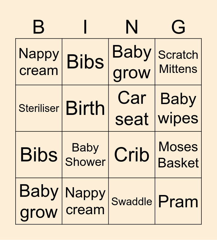 ⚠ This card has duplicate items: Nappies (2), Moses Basket (2), Crib (2), Pram (2), Car seat (2), Steriliser (2), Bottle (2), Bibs (2), Swaddle (2), Baby wipes (2), Baby grow (2), Scratch Mittens (2), Birth (2), Nappy cream (2)