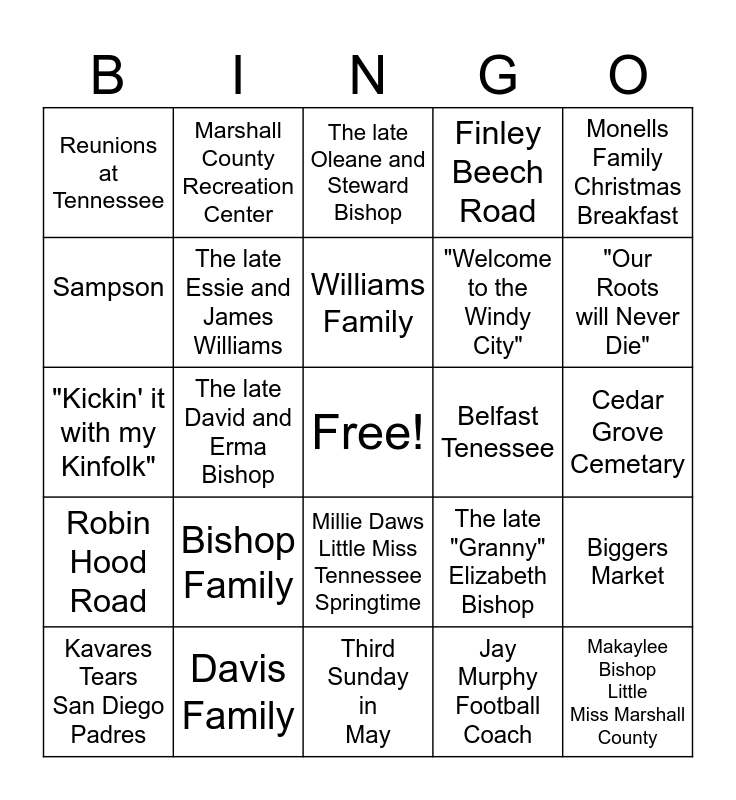 This bingo card has a free space and 24 words: Bishop Family, Davis Family, Williams Family, Kavares Tears San Diego Padres, Monells Family Christmas Breakfast, Reunions at Tennessee, Sampson, Marshall County Recreation Center, Belfast Tenessee, Millie Daws Little Miss Tennessee Springtime, "Welcome to the Windy City", "Kickin' it with my Kinfolk", The late "Granny" Elizabeth Bishop, Biggers Market, The late Essie and James Williams, Jay Murphy Football Coach, Cedar Grove Cemetary, The late Oleane and Steward Bishop, "Our Roots will Never Die", The late David and Erma Bishop, Makaylee Bishop Little Miss Marshall County, Robin Hood Road, Finley Beech Road and Third Sunday in May.