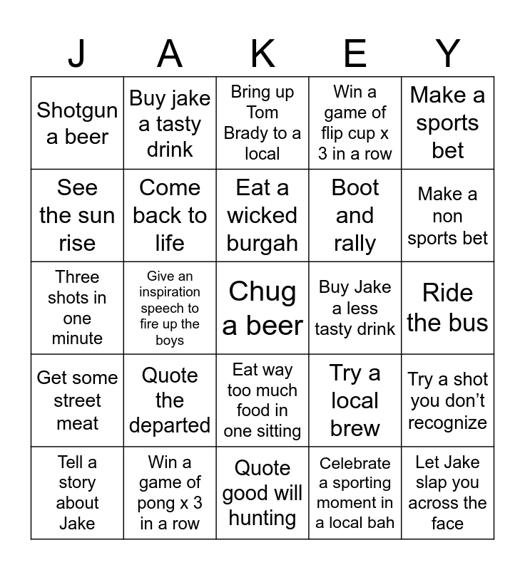This bingo card has a free space and 24 words: Quote the departed, Win a game of pong x 3 in a row, Eat a wicked burgah, Tell a story about Jake, Make a sports bet, Shotgun a beer, See the sun rise, Buy jake a tasty drink, Buy Jake a less tasty drink, Eat way too much food in one sitting, Boot and rally, Three shots in one minute, Try a local brew, Try a shot you don’t recognize, Come back to life, Celebrate a sporting moment in a local bah, Ride the bus, Bring up Tom Brady to a local, Make a non sports bet, Give an inspiration speech to fire up the boys, Let Jake slap you across the face, Get some street meat, Win a game of flip cup x 3 in a row and Quote good will hunting.