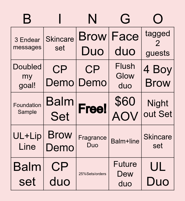 This bingo card has a free space and 25 words: Brow Demo, 25%Sets/orders, CP Demo, Balm set, tagged 2 guests, 3 Endear messages, Doubled my goal!, Skincare set, $60 AOV, Fragrance Duo, Flush Glow duo, Foundation Sample, Balm+line, Skincare set, CP Demo, Brow Demo, Night out Set, Brow Duo, 4 Boy Brow, Balm Set, UL Duo, CP duo, UL+Lip Line, Face duo and Future Dew duo.