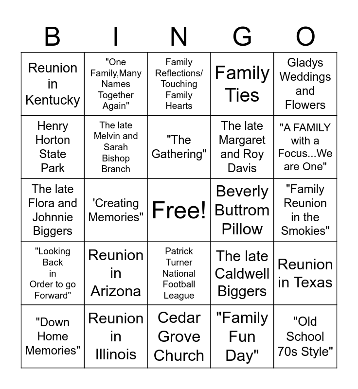 This bingo card has a free space and 24 words: Reunion in Arizona, Reunion in Illinois, "The Gathering", "Down Home Memories", Gladys Weddings and Flowers, Reunion in Kentucky, Henry Horton State Park, "One Family,Many Names Together Again", Beverly Buttrom Pillow, Patrick Turner National Football League, The late Margaret and Roy Davis, The late Flora and Johnnie Biggers, The late Caldwell Biggers, Reunion in Texas, The late Melvin and Sarah Bishop Branch, "Family Fun Day", "Family Reunion in the Smokies", Family Reflections/ Touching Family Hearts, "A FAMILY with a Focus...We are One", 'Creating Memories", "Old School 70s Style", "Looking Back in Order to go Forward", Family Ties and Cedar Grove Church.