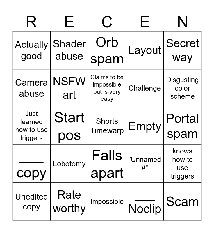 This bingo card has 25 words: Lobotomy, Impossible, Claims to be impossible but is very easy, Unedited copy, Secret way, Actually good, Camera abuse, Shader abuse, Empty, Falls apart, Challenge, Just learned how to use triggers, "Unnamed #", knows how to use triggers, NSFW art, Scam, Portal spam, Orb spam, Disgusting color scheme, Start pos, Shorts Timewarp, Rate worthy, ___ copy, Layout and ___ Noclip.