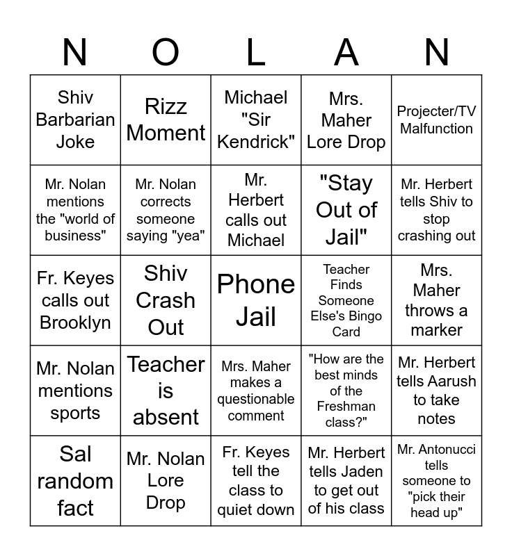 This bingo card has a free space and 24 words: Teacher is absent, Mr. Nolan Lore Drop, Mr. Herbert calls out Michael, Sal random fact, Projecter/TV Malfunction, Shiv Barbarian Joke, Mr. Nolan mentions the "world of business", Rizz Moment, Teacher Finds Someone Else's Bingo Card, Mrs. Maher makes a questionable comment, "Stay Out of Jail", Fr. Keyes calls out Brooklyn, "How are the best minds of the Freshman class?", Mr. Herbert tells Aarush to take notes, Mr. Nolan corrects someone saying "yea", Mr. Herbert tells Jaden to get out of his class, Mrs. Maher throws a marker, Michael "Sir Kendrick", Mr. Herbert tells Shiv to stop crashing out, Shiv Crash Out, Mr. Antonucci tells someone to "pick their head up", Mr. Nolan mentions sports, Mrs. Maher Lore Drop and Fr. Keyes tell the class to quiet down.