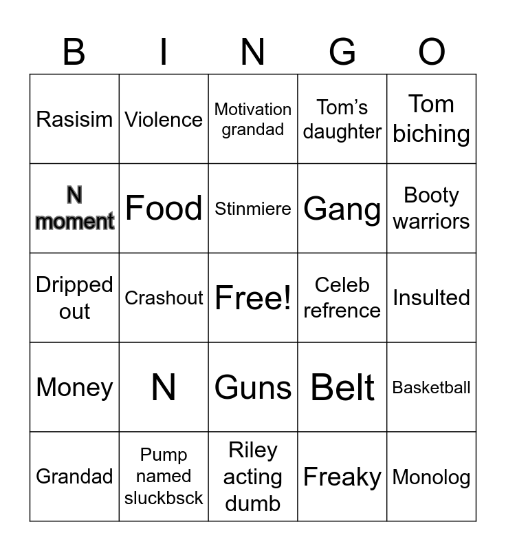 This bingo card has a free space and 24 words: N, Pump named sluckbsck, Stinmiere, Grandad, Tom biching, Rasisim, N moment, Violence, Celeb refrence, Guns, Gang, Dripped out, Belt, Basketball, Food, Freaky, Insulted, Motivation grandad, Booty warriors, Crashout, Monolog, Money, Tom’s daughter and Riley acting dumb.
