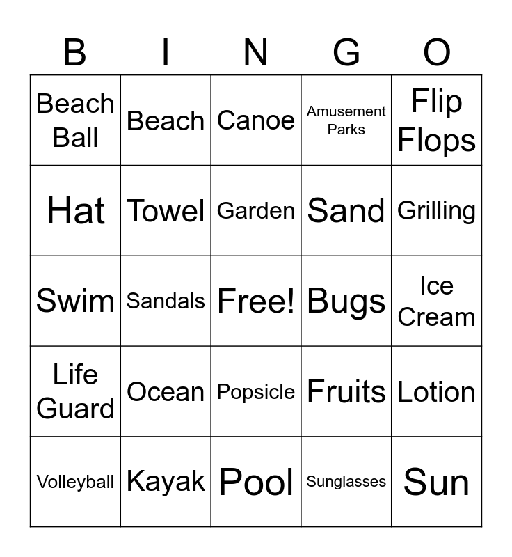 This bingo card has a free space and 52 words: Lemonade, Sun, Hot, Pool, Ocean, Lake, Beach, Vacation, Hat, Flip Flops, Towel, Sunblock, Lotion, Fruits, Swim, Camp, Garden, Bugs, Cook Outs, Flip Flops, Sandals, Sunglasses, Beach Ball, Sand, Sea Shells, Fishing, Kite, Humidity, Grilling, Waves, Dunes, Amusement Parks, Concerts, Breeze, Boat, Canoe, Kayak, Fireworks, Festivals, Hiking, Hammock, Ice Cream, Life Guard, Ocean, Popsicle, Picnic, Sandcastle, Swim, Tide, Watermelon, Volleyball and Swim Suit.