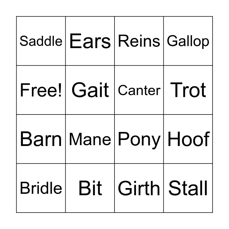 This bingo card has 16 words: Bit, Hoof, Reins, Saddle, Barn, Ears, Pony, Girth, Free!, Gait, Bridle, Gallop, Mane, Trot, Canter and Stall.