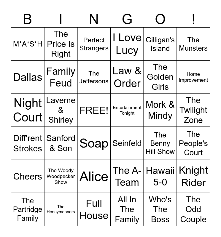 This bingo card has 36 words: The A-Team, Alice, All In The Family, Dallas, Diff'rent Strokes, Entertainment Tonight, Family Feud, Full House, Gilligan's Island, Hawaii 5-0, Home Improvement, I Love Lucy, Knight Rider, Laverne & Shirley, Law & Order, M*A*S*H, Cheers, Mork & Mindy, Night Court, Perfect Strangers, FREE!, Sanford & Son, Seinfeld, Soap, The Benny Hill Show, The Price Is Right, The Golden Girls, The Honeymooners, The Jeffersons, The Munsters, The Odd Couple, The Partridge Family, The People's Court, The Twilight Zone, The Woody Woodpecker Show and Who's The Boss.