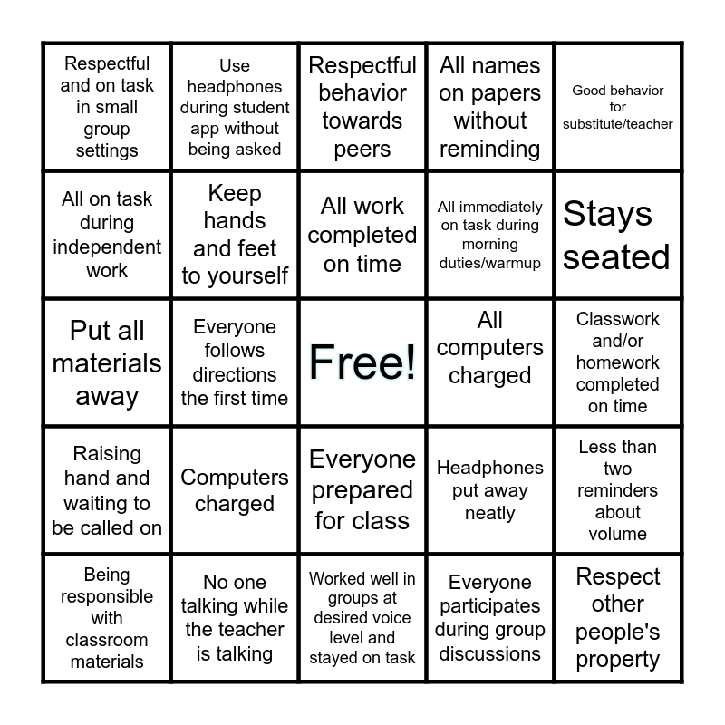 This bingo card has a free space and 24 words: Computers charged, No one talking while the teacher is talking, All work completed on time, Being responsible with classroom materials, Good behavior for substitute/teacher, Respectful and on task in small group settings, All on task during independent work, Use headphones during student app without being asked, All computers charged, Everyone prepared for class, All immediately on task during morning duties/warmup, Put all materials away, Headphones put away neatly, Less than two reminders about volume, Keep hands and feet to yourself, Everyone participates during group discussions, Classwork and/or homework completed on time, Respectful behavior towards peers, Stays seated, Everyone follows directions the first time, Respect other people's property, Raising hand and waiting to be called on, All names on papers without reminding and Worked well in groups at desired voice level and stayed on task.