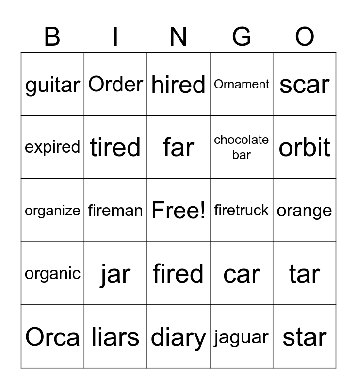 This bingo card has a free space and 24 words: Orca, jar, far, jaguar, scar, guitar, Order, hired, firetruck, orange, organize, tired, car, tar, expired, liars, diary, Ornament, orbit, organic, fireman, fired, chocolate bar and star.