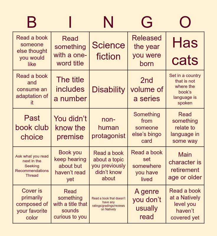 This bingo card has 25 words: Book you keep hearing about but haven’t read yet, Read a book that doesn’t have any ratings/gradings/reviews on Natively, Disability, Cover is primarily composed of your favorite color, Has cats, Read a book someone else thought you would like, Read a book and consume an adaptation of it, Read something with a one-word title, Something from someone else’s bingo card, Read a book about a topic you previously didn’t know about, 2nd volume of a series, Past book club choice, Read a book set somewhere you have lived, Main character is retirement age or older, The title includes a number, Read a book at a Natively level you haven’t covered yet, Read something relate to language in some way, Science fiction, Set in a country that is not where the book’s language is spoken, You didn’t know the premise, non-human protagonist, Read something with a title that sounds curious to you, Ask what you read next in the Seeking Recommendations Thread, Released the year you were born and A genre you don’t usually read.