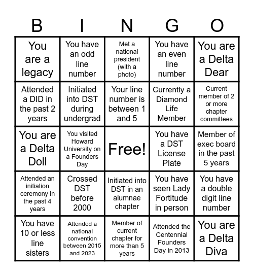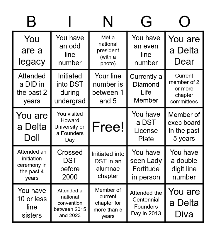 This bingo card has a free space and 29 words: You have 10 or less line sisters, Attended a Regional Conference in 2022, You visited Howard University on a Founders Day, You have 25 or more line sisters, You are a legacy, Met a national president (with a photo), Initiated into DST during undergrad, Crossed DST before 2000, You have a DST License Plate, Attended a national convention between 2015 and 2023, Member of exec board in the past 5 years, You are a Delta Diva, Member of current chapter for more than 5 years, Attended the Centennial Founders Day in 2013, Current member of 2 or more chapter committees, You have 22 or more elephants, Initiated into DST in an alumnae chapter, Attended an initiation ceremony in the past 4 years, You are a Delta Dear, You are a Delta Doll, You have seen Lady Fortitude in person, Served on Scholarship Committee for more than 5 years, Currently a Diamond Life Member, Attended a DID in the past 2 years, You have an even line number, You have an odd line number, You have a double digit line number, Your line number is between 1 and 5 and You have an African Violet.