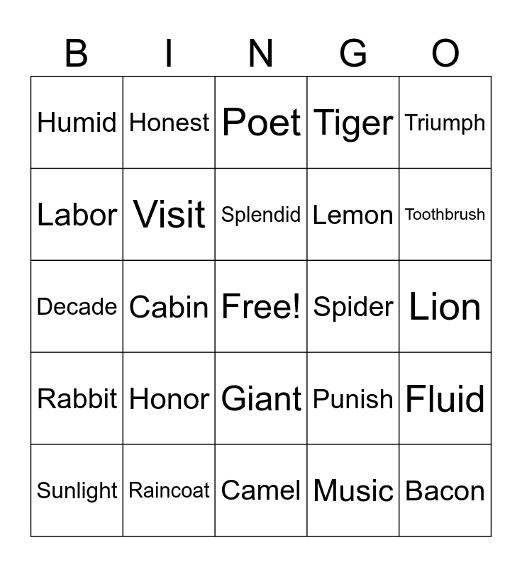 This bingo card has a free space and 24 words: Honor, Raincoat, Splendid, Sunlight, Triumph, Humid, Labor, Honest, Spider, Giant, Lemon, Decade, Punish, Fluid, Visit, Music, Lion, Poet, Toothbrush, Cabin, Bacon, Rabbit, Tiger and Camel.