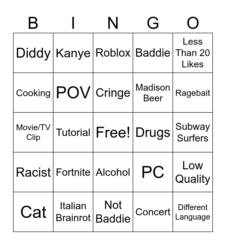 This bingo card has a free space and 24 words: Fortnite, Italian Brainrot, Cringe, Cat, Less Than 20 Likes, Diddy, Cooking, Kanye, Drugs, Alcohol, Madison Beer, Movie/TV Clip, PC, Low Quality, POV, Concert, Subway Surfers, Roblox, Ragebait, Tutorial, Different Language, Racist, Baddie and Not Baddie.