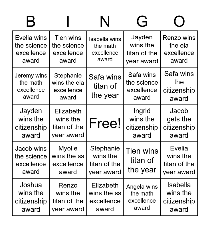 This bingo card has a free space and 34 words: Angela gets the citizenship award, Tien gets the citizenship award, Elizabeth gets the citizenship award, Renzo gets the citizenship award, Jacob gets the citizenship award, Jeremy wins the math excellence award, Stephanie wins the ela excellence award, Elizabeth wins the ss excellence award, Safa wins the science excellence award, Isabella wins the citizenship award, Jayden wins the citizenship award, Tien wins the science excellence award, Angela wins the math excellence award, Isabella wins the ss excellence award, Jacob wins the science excellence award, Elizabeth wins the titan of the year award, Stephanie wins the titan of the year award, Ingrid wins the citizenship award, Evelia wins the titan of the year award, Joshua wins the citizenship award, Renzo wins the titan of the year award, Fatou wins the citizenship award, Jayden wins the titan of the year award, Safa wins the citizenship award, Myolie wins the citizenship award, Myolie wins the ss excellence award, Isabella wins the math excellence award, Stephanie wins the citizenship award, Renzo wins the ela excellence award, Evelia wins the science excellence award, Myolie wins titan of the year, Safa wins titan of the year, Tien wins titan of the year and Angela wins titan of the year.