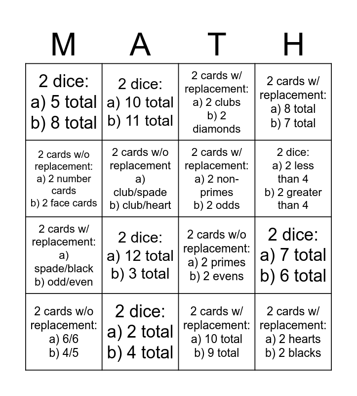 This bingo card has 20 words: 2 dice: a) 7 total b) 6 total, 2 dice: a) matching numbers b) 9, 2 cards w/ replacement: a) 2 clubs b) 2 diamonds, 2 cards w/ replacement: a) 2 reds b) 2 spades, 2 cards w/o replacement: a) 6/6 b) 4/5, 2 cards w/o replacement: a) 2 number cards b) 2 face cards, 2 dice: a) 2 total b) 4 total, 2 dice: a) 5 total b) 8 total, 2 cards w/ replacement: a) spade/black b) odd/even, 2 dice: a) 10 total b) 11 total, 2 dice: a) 12 total b) 3 total, 2 cards w/o replacement: a) 2 primes b) 2 evens, 2 cards w/o replacement a) club/spade b) club/heart, 2 cards w/ replacement: a) 2 hearts b) 2 blacks, 2 cards w/ replacement: a) 2 non-primes b) 2 odds, 2 cards w/o replacement: a) heart/red b) even/odd, 2 dice: a) 2 less than 4 b) 2 greater than 4, 2 cards w/ replacement: a) 8 total b) 7 total, 2 cards w/ replacement: a) 10 total b) 9 total and 2 cards w/o replacement: a) diamond/red b) club/black.