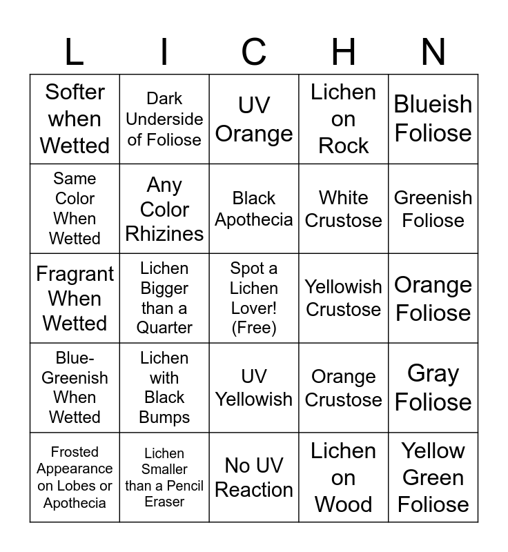 This bingo card has a free space and 24 words: Frosted Appearance on Lobes or Apothecia, Lichen with Black Bumps, Black Apothecia, Lichen on Wood, Blueish Foliose, Softer when Wetted, Dark Underside of Foliose, UV Orange, Yellowish Crustose, Orange Foliose, Fragrant When Wetted, Any Color Rhizines, Orange Crustose, Gray Foliose, Same Color When Wetted, Lichen Smaller than a Pencil Eraser, No UV Reaction, Lichen on Rock, Greenish Foliose, Blue-Greenish When Wetted, Lichen Bigger than a Quarter, UV Yellowish, White Crustose and Yellow Green Foliose.