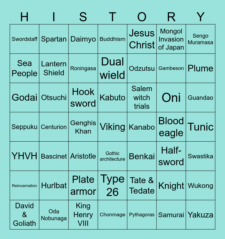 This bingo card has 49 words: Knight, Gambeson, Pythagoras, Centurion, Hook sword, Tunic, Spartan, King Henry VIII, Mongol Invasion of Japan, Gothic architecture, Sengo Muramasa, Buddhism, Oni, Salem witch trials, Hurlbat, Blood eagle, Sea People, Plume, Wukong, Jesus Christ, Odzutsu, Genghis Khan, Swordstaff, Lantern Shield, David & Goliath, Roningasa, Guandao, Oda Nobunaga, Kabuto, Otsuchi, Yakuza, Kanabo, Reincarnation, Plate armor, Seppuku, Benkai, Half-sword, Swastika, Godai, Aristotle, Type 26, YHVH, Viking, Chonmage, Dual wield, Daimyo, Tate & Tedate, Bascinet and Samurai.