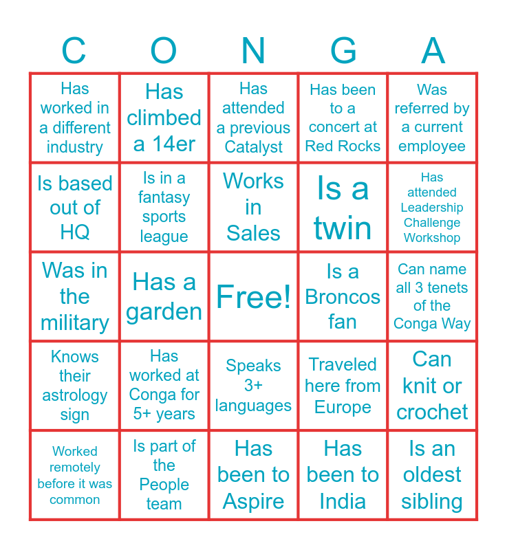 This bingo card has a free space and 24 words: Has worked at Conga for 5+ years, Is part of the People team, Works in Sales, Worked remotely before it was common, Was referred by a current employee, Has worked in a different industry, Is based out of HQ, Has climbed a 14er, Is a Broncos fan, Speaks 3+ languages, Is a twin, Was in the military, Traveled here from Europe, Can knit or crochet, Is in a fantasy sports league, Has been to India, Can name all 3 tenets of the Conga Way, Has attended a previous Catalyst, Has attended Leadership Challenge Workshop, Has a garden, Is an oldest sibling, Knows their astrology sign, Has been to a concert at Red Rocks and Has been to Aspire.