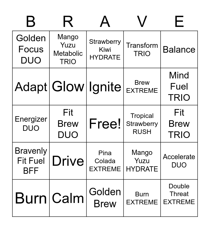 This bingo card has a free space and 24 words: Drive, Calm, Ignite, Burn, Balance, Golden Focus DUO, Adapt, Mango Yuzu Metabolic TRIO, Tropical Strawberry RUSH, Pina Colada EXTREME, Brew EXTREME, Energizer DUO, Mango Yuzu HYDRATE, Accelerate DUO, Glow, Burn EXTREME, Fit Brew TRIO, Strawberry Kiwi HYDRATE, Mind Fuel TRIO, Fit Brew DUO, Double Threat EXTREME, Bravenly Fit Fuel BFF, Transform TRIO and Golden Brew.