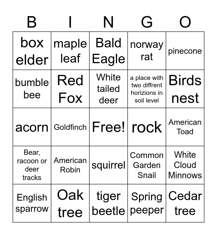 This bingo card has a free space and 24 words: American Robin, Oak tree, White tailed deer, English sparrow, pinecone, box elder, bumble bee, maple leaf, rock, squirrel, a place with two diffrent horizions in soil level, acorn, Common Garden Snail, White Cloud Minnows, Red Fox, Spring peeper, American Toad, Bald Eagle, Birds nest, Goldfinch, Cedar tree, Bear, racoon or deer tracks, norway rat and tiger beetle.