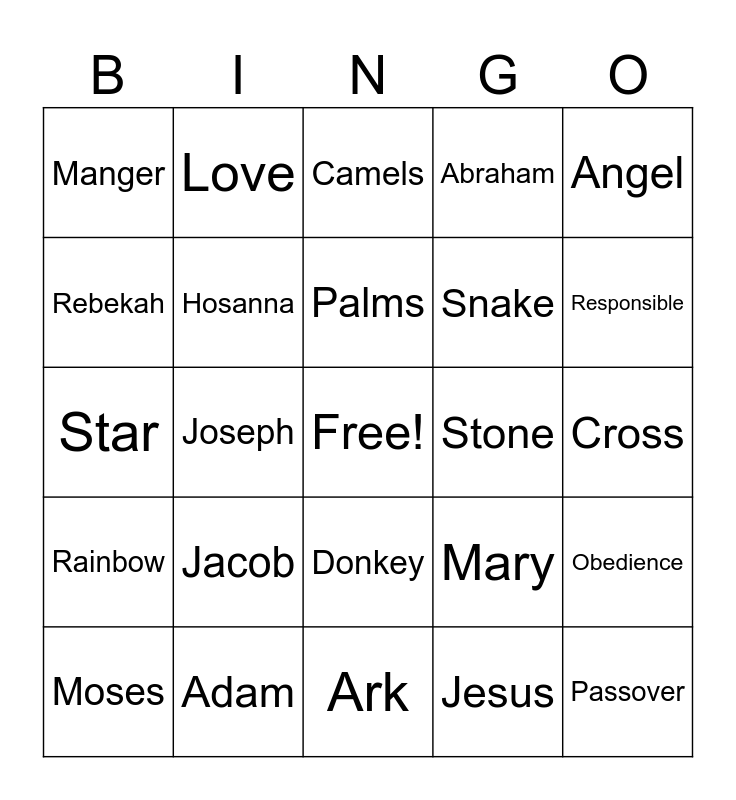 This bingo card has a free space and 24 words: Jacob, Adam, Palms, Moses, Angel, Manger, Rebekah, Love, Stone, Donkey, Snake, Star, Mary, Obedience, Hosanna, Jesus, Cross, Camels, Responsible, Joseph, Passover, Rainbow, Abraham and Ark.