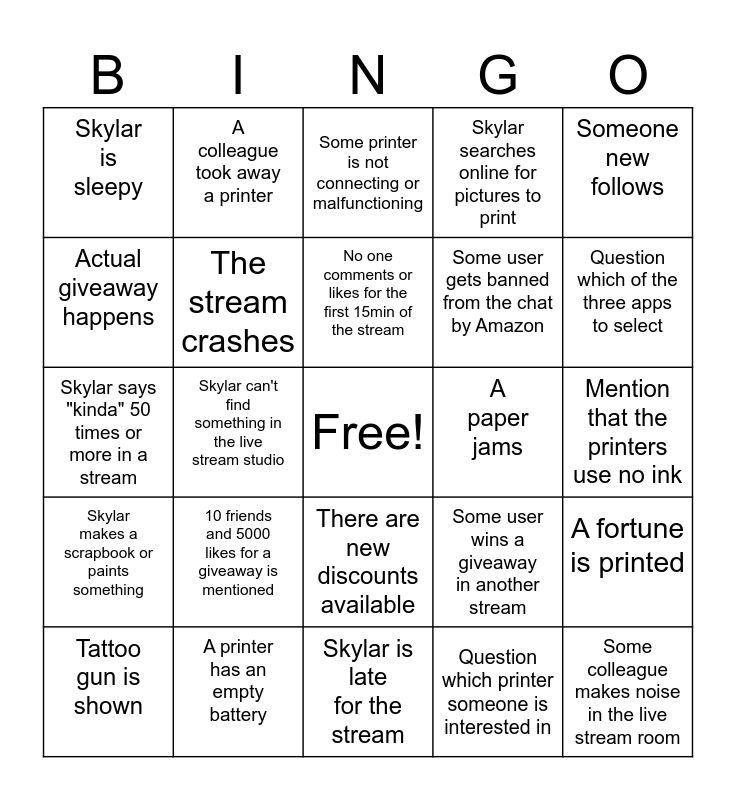 This bingo card has a free space and 24 words: 10 friends and 5000 likes for a giveaway is mentioned, A printer has an empty battery, No one comments or likes for the first 15min of the stream, Tattoo gun is shown, Someone new follows, Skylar is sleepy, Actual giveaway happens, A colleague took away a printer, A paper jams, There are new discounts available, Some user gets banned from the chat by Amazon, Skylar says "kinda" 50 times or more in a stream, Some user wins a giveaway in another stream, A fortune is printed, The stream crashes, Question which printer someone is interested in, Mention that the printers use no ink, Some printer is not connecting or malfunctioning, Question which of the three apps to select, Skylar can't find something in the live stream studio, Some colleague makes noise in the live stream room, Skylar makes a scrapbook or paints something, Skylar searches online for pictures to print and Skylar is late for the stream.