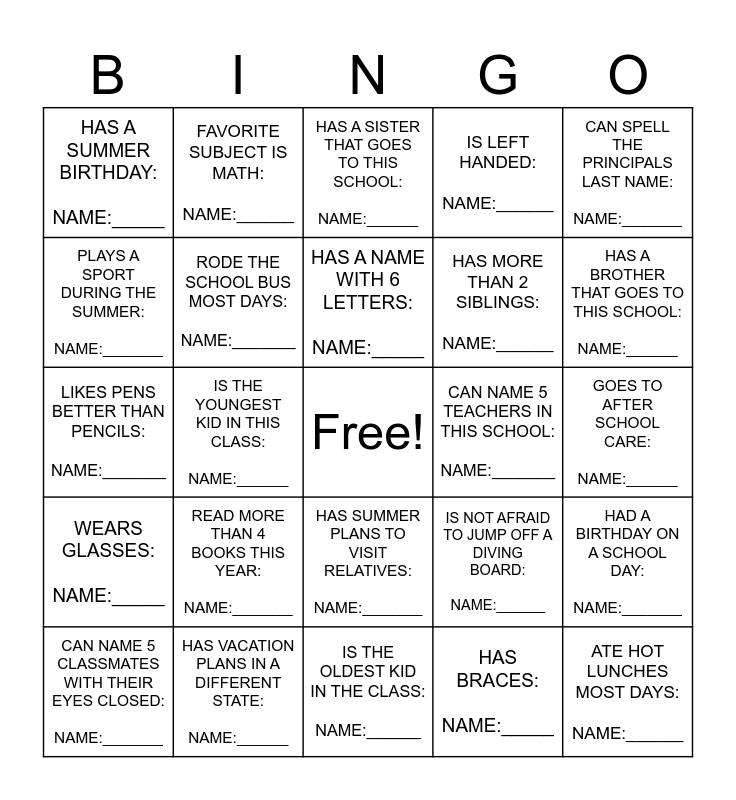 This bingo card has a free space and 24 words: READ MORE THAN 4 BOOKS THIS YEAR: NAME:_______, HAS VACATION PLANS IN A DIFFERENT STATE: NAME:______, HAS A NAME WITH 6 LETTERS: NAME:_____, CAN NAME 5 CLASSMATES WITH THEIR EYES CLOSED: NAME:_______, CAN SPELL THE PRINCIPALS LAST NAME: NAME:_______, HAS A SUMMER BIRTHDAY: NAME:_____, PLAYS A SPORT DURING THE SUMMER: NAME:_______, FAVORITE SUBJECT IS MATH: NAME:______, CAN NAME 5 TEACHERS IN THIS SCHOOL: NAME:_______, HAS SUMMER PLANS TO VISIT RELATIVES: NAME:_______, HAS MORE THAN 2 SIBLINGS: NAME:______, LIKES PENS BETTER THAN PENCILS: NAME:_______, IS NOT AFRAID TO JUMP OFF A DIVING BOARD: NAME:______, HAD A BIRTHDAY ON A SCHOOL DAY: NAME:_______, RODE THE SCHOOL BUS MOST DAYS: NAME:_______, HAS BRACES: NAME:_____, GOES TO AFTER SCHOOL CARE: NAME:______, HAS A SISTER THAT GOES TO THIS SCHOOL: NAME:______, HAS A BROTHER THAT GOES TO THIS SCHOOL: NAME:______, IS THE YOUNGEST KID IN THIS CLASS: NAME:______, ATE HOT LUNCHES MOST DAYS: NAME:______, WEARS GLASSES: NAME:_____, IS LEFT HANDED: NAME:______ and IS THE OLDEST KID IN THE CLASS: NAME:______.