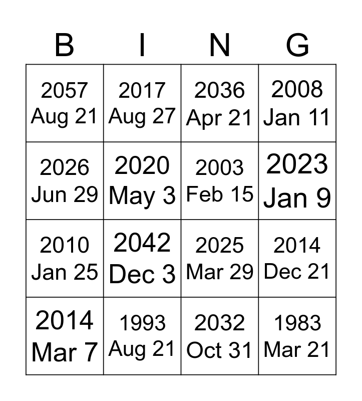 This bingo card has 16 words: 1993 Aug 21, 2014 Dec 21, 2036 Apr 21, 2057 Aug 21, 2010 Jan 25, 2017 Aug 27, 2025 Mar 29, 2032 Oct 31, 2026 Jun 29, 2020 May 3, 2014 Mar 7, 2008 Jan 11, 2042 Dec 3, 2023 Jan 9, 2003 Feb 15 and 1983 Mar 21.
