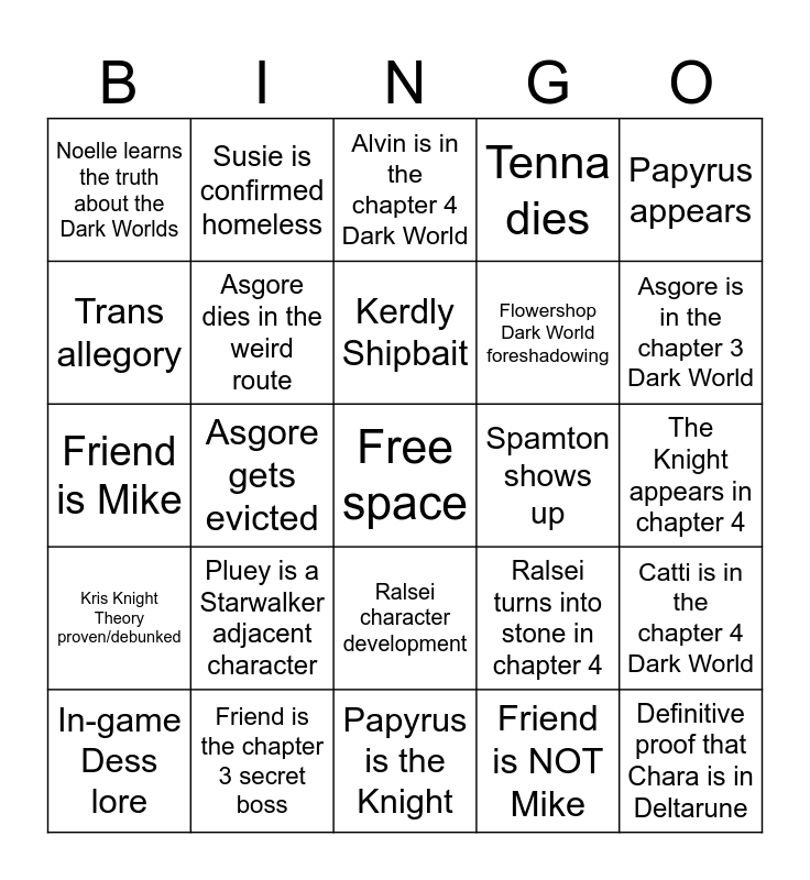 This bingo card has a free space and 24 words: Pluey is a Starwalker adjacent character, Friend is the chapter 3 secret boss, Kerdly Shipbait, In-game Dess lore, Papyrus appears, Noelle learns the truth about the Dark Worlds, Trans allegory, Susie is confirmed homeless, Spamton shows up, Ralsei character development, Flowershop Dark World foreshadowing, Friend is Mike, Ralsei turns into stone in chapter 4, Catti is in the chapter 4 Dark World, Asgore dies in the weird route, Friend is NOT Mike, The Knight appears in chapter 4, Alvin is in the chapter 4 Dark World, Asgore is in the chapter 3 Dark World, Asgore gets evicted, Definitive proof that Chara is in Deltarune, Kris Knight Theory proven/debunked, Tenna dies and Papyrus is the Knight.