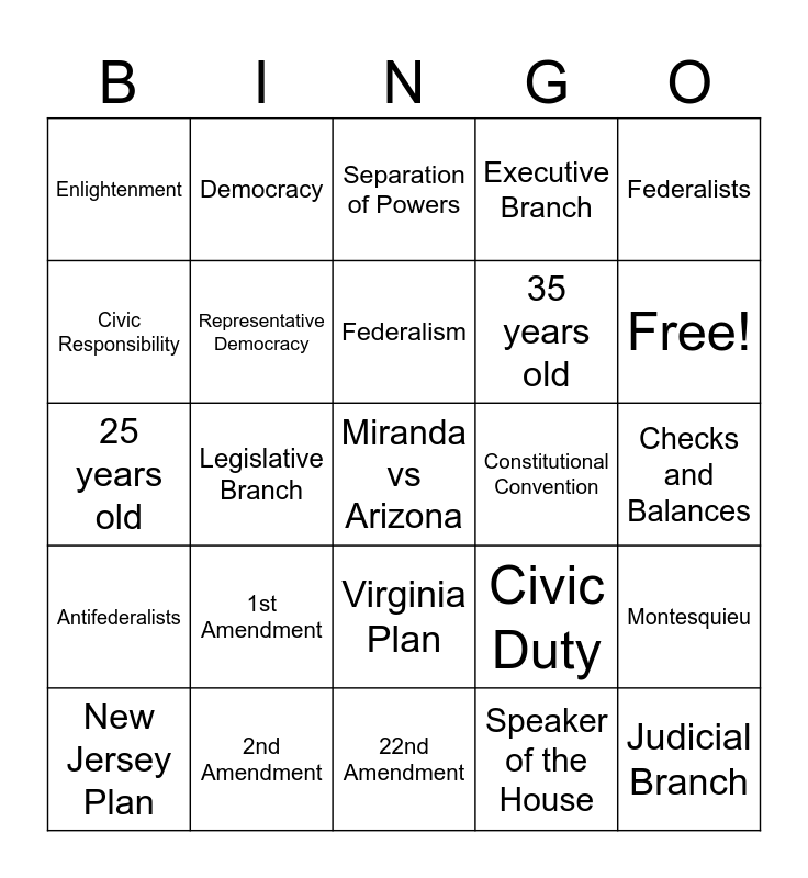 This bingo card has a free space and 39 words: Unitary System, Federal System, Presidential Government, Representative Democracy, New Jersey Plan, Virginia Plan, Federalism, The Bill of Rights, Federalists, Antifederalists, Legislative Branch, Executive Branch, Judicial Branch, Checks and Balances, Constitutional Convention, 1st Amendment, Social Contract Theory, Enlightenment, Impeachment, Civic Duty, Civic Responsibility, 22nd Amendment, 35 years old, Free!, Electoral College, Presidential Election Day, Split Ticket Voting, Vice President, Lobbyist, Democracy, Capitalism, Amendments, Separation of Powers, 2nd Amendment, Speaker of the House, John Locke, Montesquieu, 25 years old and 30 years old.