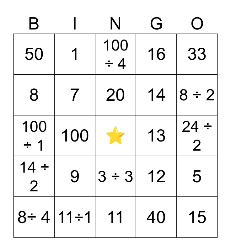 This bingo card has a free space and 48 words: 3, 15, 10, 11, 9, 0, 1, 4, 8, 6, 7, 16, 5, 12, 30, 2, 20, 13, 25, 33, 100, 40, 50, 14, 3 ÷ 1, 8 ÷ 2, 8÷ 4, 10 ÷ 2, 3 ÷ 3, 14 ÷ 2, 20 ÷ 2, 18 ÷ 2, 30 ÷ 2, 8 ÷ 1, 11÷1, 28 ÷ 2, 24 ÷ 4, 24 ÷ 2, 0 ÷ 0, 32 ÷ 2, 26 ÷ 2, 40÷2, 100 ÷ 4, 100 ÷ 2, 100 ÷ 1, 60 ÷ 2, 80 ÷ 2 and 66 ÷ 2.